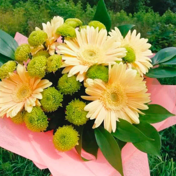 Попасть в объятия к солнцу и окружить любимую теплотой теперь еще проще! Достаточно заказать на сайте этот потрясающий по красоте букет, от которого веет положительными эмоциями. Роскошные желтые садовые герберы и миниатюрные головки зеленых хризантем составляют достойный дуэт красок. Букет понравится жизнерадостным девушкам и женщинам, он привнесет в их жизнь частичку праздника, жаркого лета и мирного солнца.