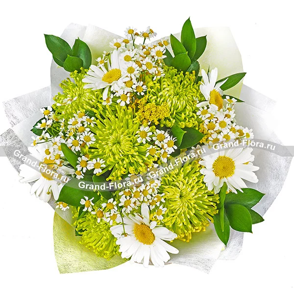 Люкс: хризантема одноголовая зеленая - 9 шт, танацетум - 8 шт, ромашка белая - 9 шт, рускус, фетр зеленый и белый.