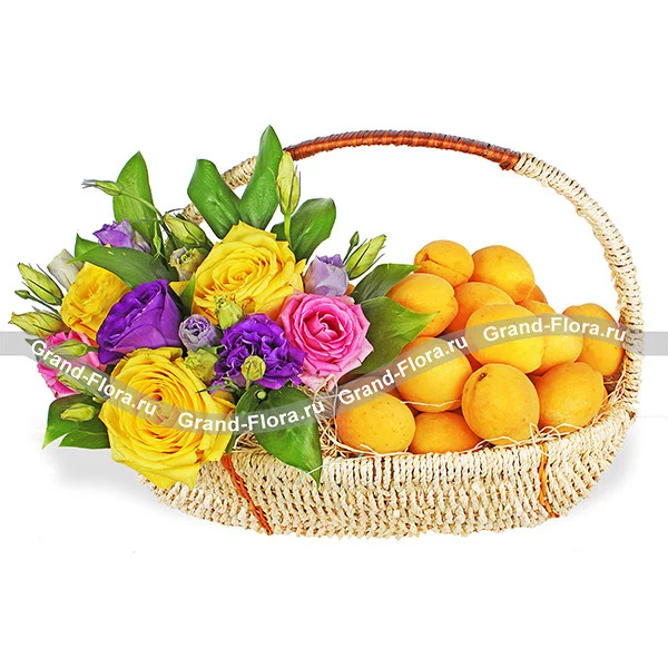 Стандартный: роза желтая - 3 шт., роза розовая - 2 шт., эустома фиолетовая - 1 шт., рускус - 2 шт., оазис, корзина средняя, абрикосы - 1,5 кг.