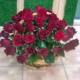 Выбрали 51 розу. Заказали доставку по случаю юбилея нашего руководителя и очень рады что выбрали именно эту компанию! Все соответствует фото на сайте: светлая корзина и отменные, крупные красные розы.