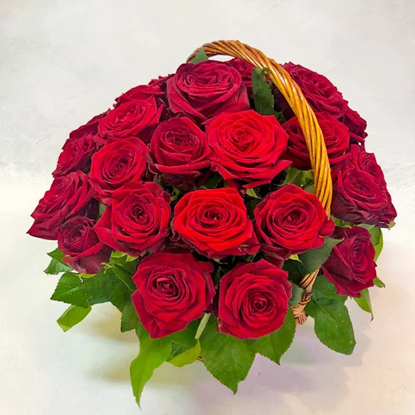 21 роза: роза красная - 21 шт., оазис, корзина.