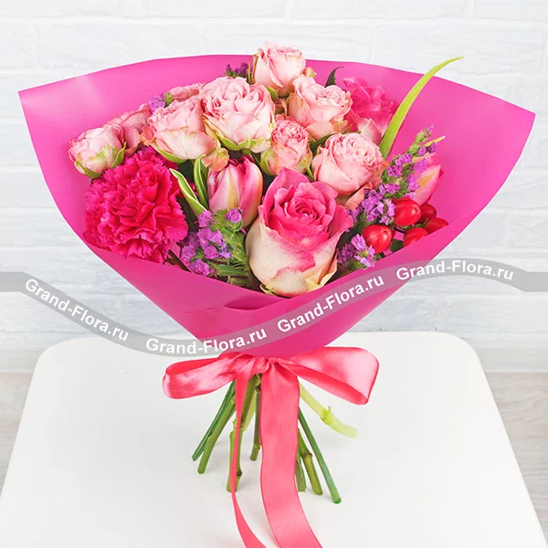 Стандартный: гвоздика малиновая - 3 шт., роза розовая - 3 шт., тюльпан розовый - 3 шт., роза кустовая розовая - 2 шт., статица, гиперикум, упаковка, лента. Примерный размер 30Хсм.