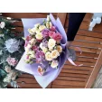 Предложили замену фиолетовых роз на эустому и розовые розы. Согласилась. Букет получился отличный! Более яркий чем на фото, но я очень довольна.